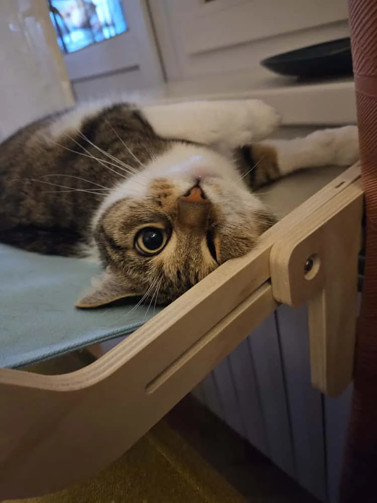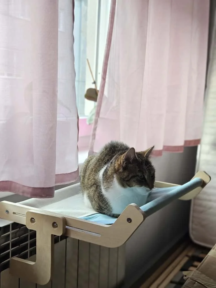 Introducing the Upgraded Wooden Hammock Pet Nest, a sophisticated and sturdy retreat designed for the ultimate feline relaxation. Crafted from high-quality wooden multi-layer plywood and breathable cotton hemp cloth, this pet nest offers a blend of modern style and lasting durability. The addition of 304 stainless steel hardware ensures a secure and stable structure for your beloved cat.